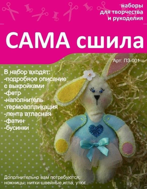 В набор входит: подробное описание с выкройками, фетр, бусинки, термоаппликации, синтетический наполнитель, лента атласная, фатин.