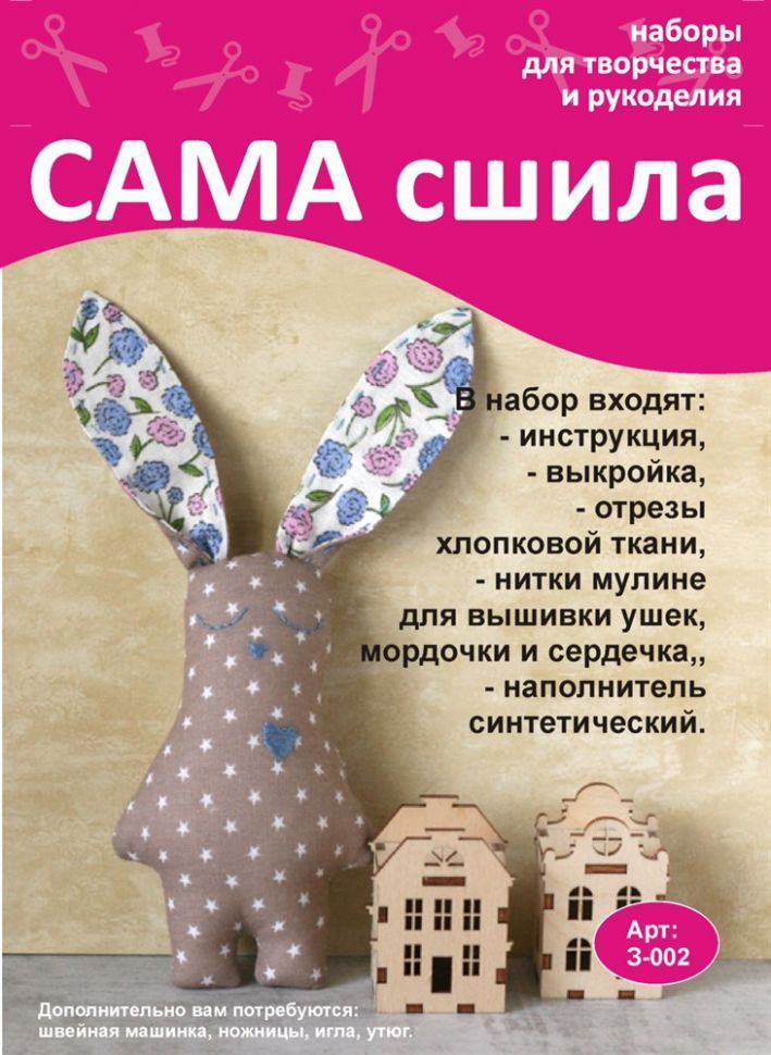 В набор входит: инструкция, выкройка, отрезы хлопковых тканей, нитка мулине для вышивки ушей, мордочки и сердечка, материал для набивки готовой игрушки