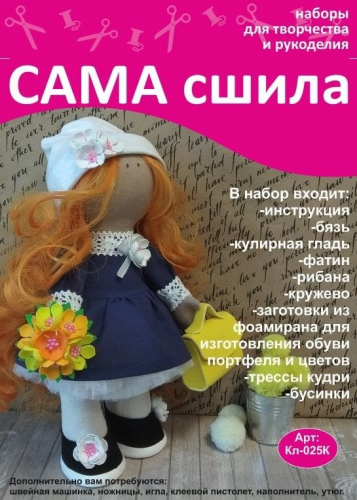 В наборы входит: инструкция, выкройка, отрезы необходимой ткани и другие материалы, которые вам понадобятся при изготовлении куклы (фоамиран, пуговки, помпоны, фетр и т.п.) – всё необходимое, кроме наполнителя. Вы можете использовать наполнитель – синтепон, синтетический пух или холлофайбер. На каждую куколку необходимо приобрести около 160-180 гр наполнителя. Все зависит от того, насколько плотно вы будете набивать игрушку. Дополнительно, вам понадобится некоторое количество материалов и инструментов: швейная машинка, утюг и т.п. Список необходимого можно найти на упаковке.