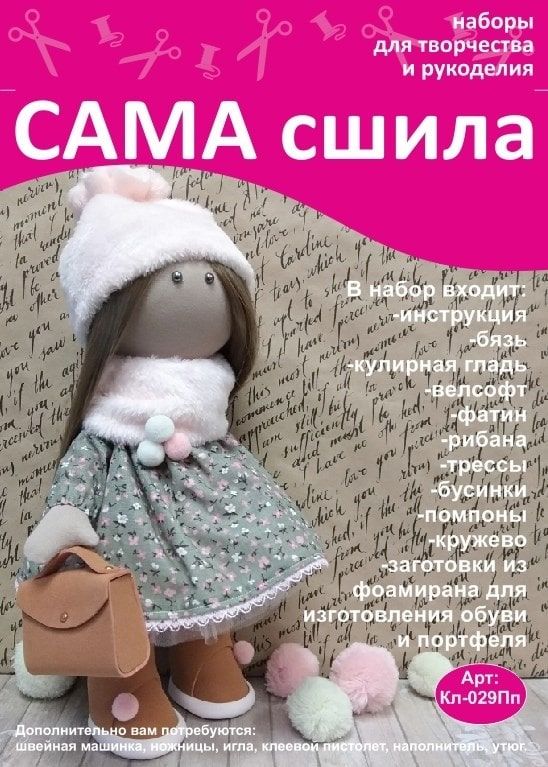 В наборы входит: инструкция, выкройка, отрезы необходимой ткани и другие материалы, которые вам понадобятся при изготовлении куклы (фоамиран, пуговки, помпоны, фетр и т.п.) – всё необходимое, кроме наполнителя. Вы можете использовать наполнитель – синтепон, синтетический пух или холлофайбер. На каждую куколку необходимо приобрести около 160-180 гр наполнителя. Все зависит от того, насколько плотно вы будете набивать игрушку. Дополнительно, вам понадобится некоторое количество материалов и инструментов: швейная машинка, утюг и т.п. Список необходимого можно найти на упаковке.
