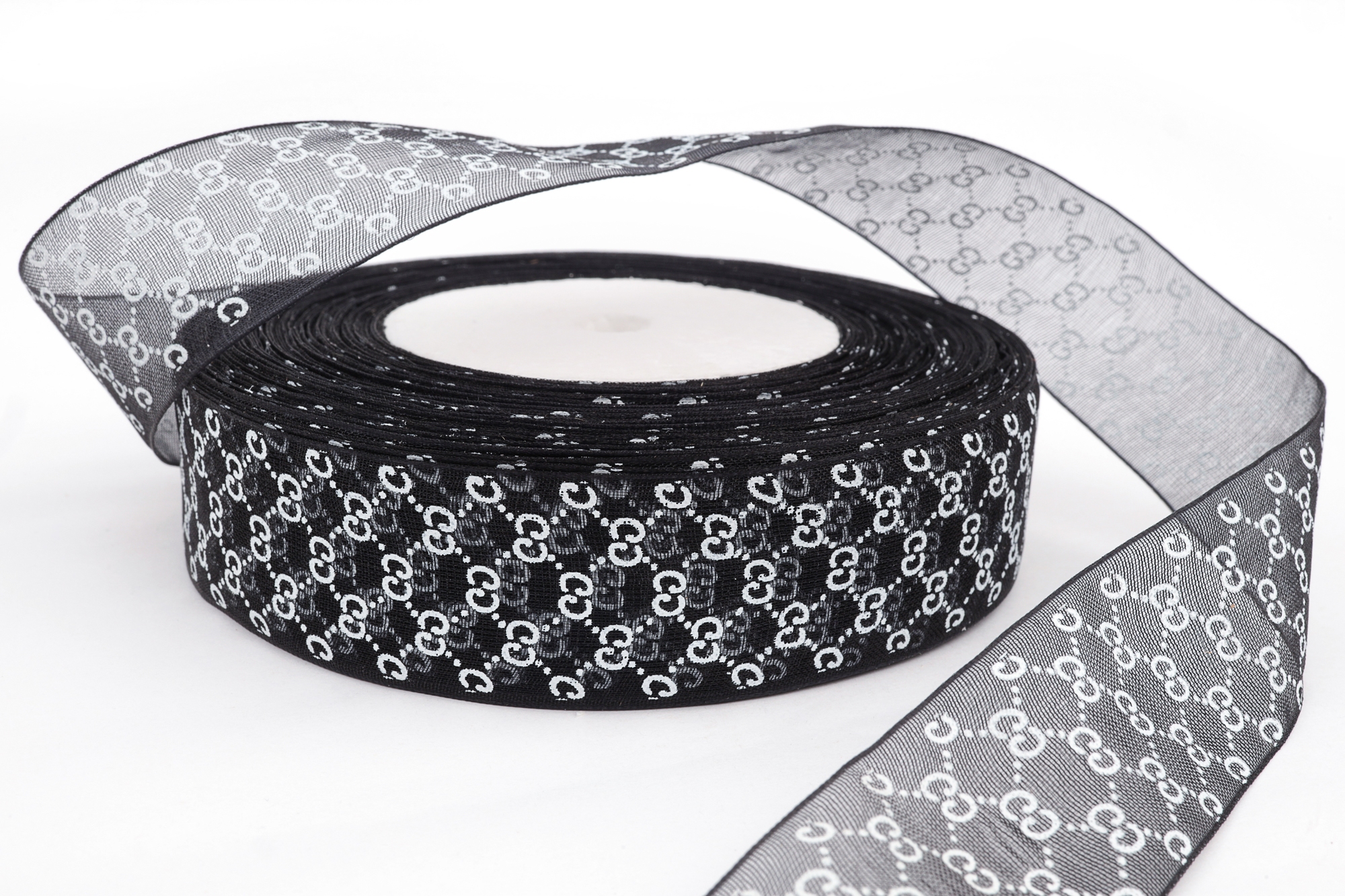 Органза с рисунком "Цепь"(черный), 25мм * 50 ярдов(+-1м) применяется не только для  рукоделия: отделка, скрапбукинг, украшение, декор, упаковка, изготовление цветов, канзаши, но и для отделки швейных изделий, декоративной отделки одежды, для украшения кукол, мягкой игрушки, для упаковки подарков.