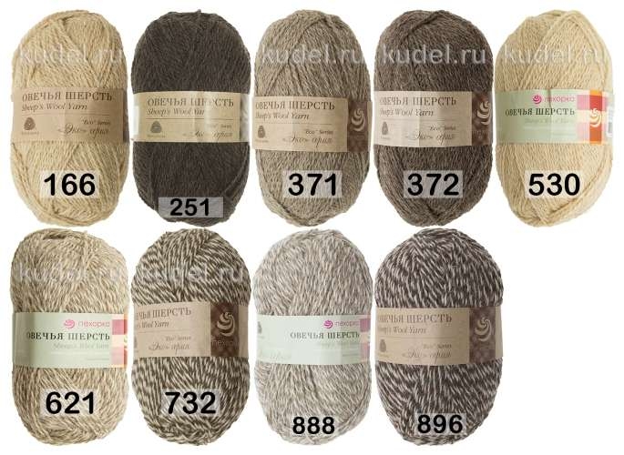 Овечья шерсть натуральных оттенков средней толщины. Умеренно скрученная, колючеватая, но очень тёплая. Подходит для любителей естественности в трикотаже, так как позволяет создать вещи в стиле кантри. Предназначена для вязания мужских свитеров, жилетов, женских кардиганов. Для детей желательно сажать вещи на подклад. Рекомендуемые инструменты - спицы 3,5 - 4,75 крючок 3-4. На вязаном образце 10х10см получается 28 рядов по 21 петле. Узоры - резинки, гладь, косы, араны, полуажур.