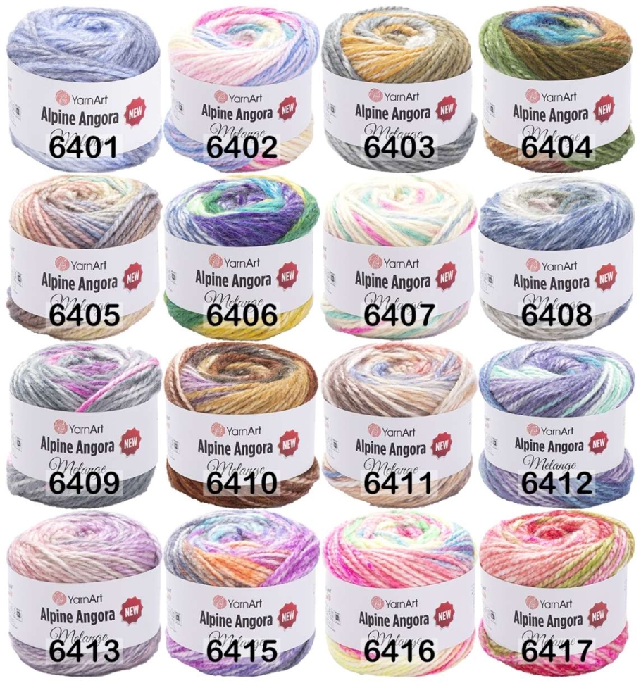 ЯрнАрт Альпайн ангора меланж. Полушерстяная пряжа меланжевого крашения. Производители рекомендуют спицы № 9. На вязаном образце 10х10см получается 7 рядов по 8 петель. Для размера S потребуется 400 гр., М: 500 гр., L: 600 гр. Пряжи.