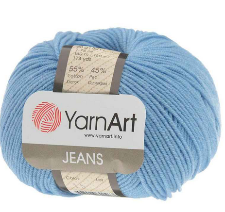 Пряжа 'Jeans' мягкая и приятная на ощупь, состоит наполовину из высококачественного хлопка, с добавлением полиакрила, что позволяет изделию отлично держать форму, придает устойчивость к усадке. Пряжа имеет равномерное окрашивание, сохраняет цвет после стирки.