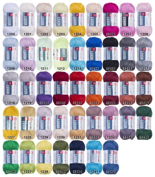 ЯрнАрт люксор. Нить с легким блеском, который придает особое очарование связанным из нее вещам. Пряжа одинаково хорошо вяжется как спицами, так и крючком. В полотне узоры смотрятся рельефно, особенно хороши ажуры. Подходит для детей и людей с чувствительной кожей. Пряжа приятная, упругая с богатой цветовой палитрой. Подходит для вязания одежды для детей и взрослых, а также для игрушек, пледов и домашнего декора. Производители рекомендуют спицы и крючок №3.5. На вязаном образце 10х10см получается 36 рядов по 26 петель.