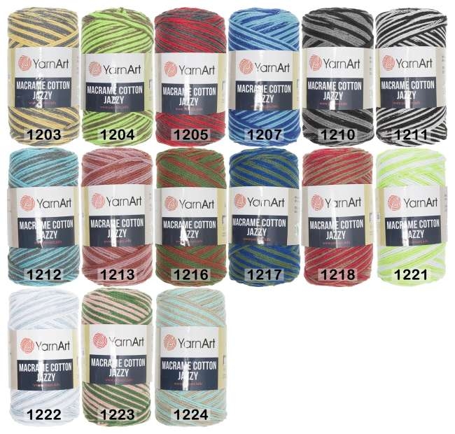 ЯрнАрт макраме коттон джази. Рекомендуемый размер спиц и крючка №5. Плотность вязания 10х10 см: спицами 18п х 24р, крючком 13п х 20р.