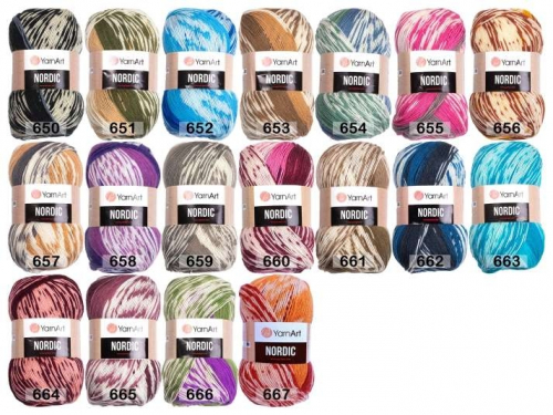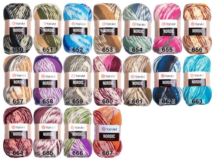 ЯрнАрт нордик. Классическая принтованная полушерсть. Производители рекомендуют спицы и крючок №4. На вязаном образце 10х10см получается 20 рядов по 24 петли.