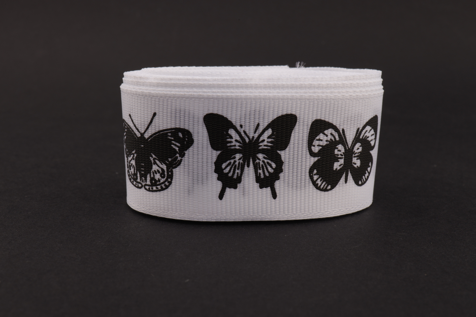 Купить репсовую ленту белого цвета с рисунком "Черные бабочки" как оптом, так и в розницу по оптовым ценам можно в нашем интернет-магазине lentoff.ru