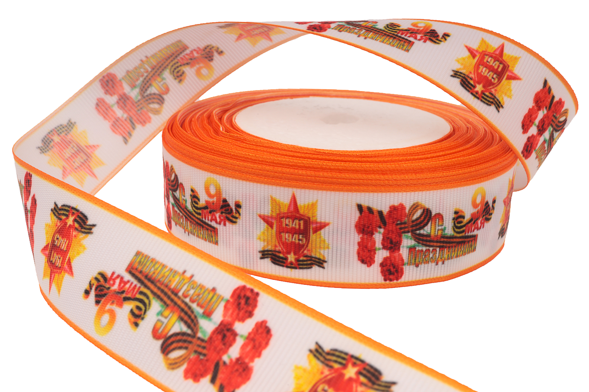 Купить репсовую ленту белого цвета с рисунком "9 МАЯ" по оптовой цене с гарантией качества в любое время можно в нашем интернет-магазине: lentoff.ru