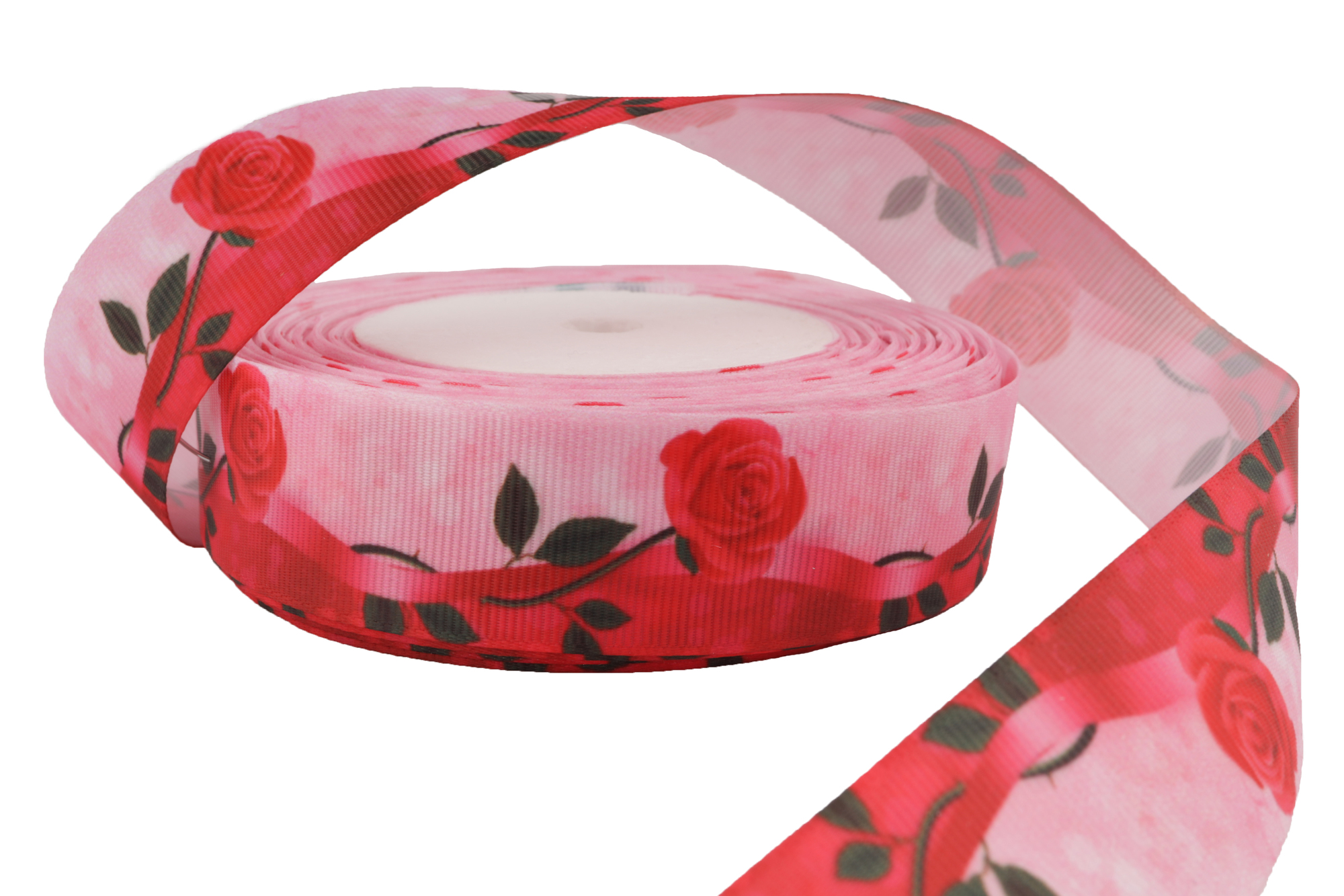 Репсовая лента с рисунком "Алая роза" (розовый), 25мм * 25 ярдов(+-1м)