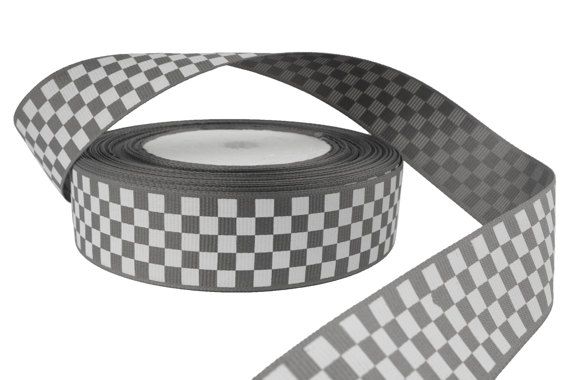 Репсовая лента с рисунком "Клетка" (темно-серый), 25мм * 25 ярдов (+-1) обладает плотной тканной текстурой и имеет  мелкий поперечный рубчик. Одной из особенностей репсовой ленты является то, что она великолепно держит форму и не деформируется при многократном использовании. Использование репсовой ленты многогранно: как при пошиве детской и взрослой одежды, так и в качестве отделочного материала при работе с плотной тканью или кожей.