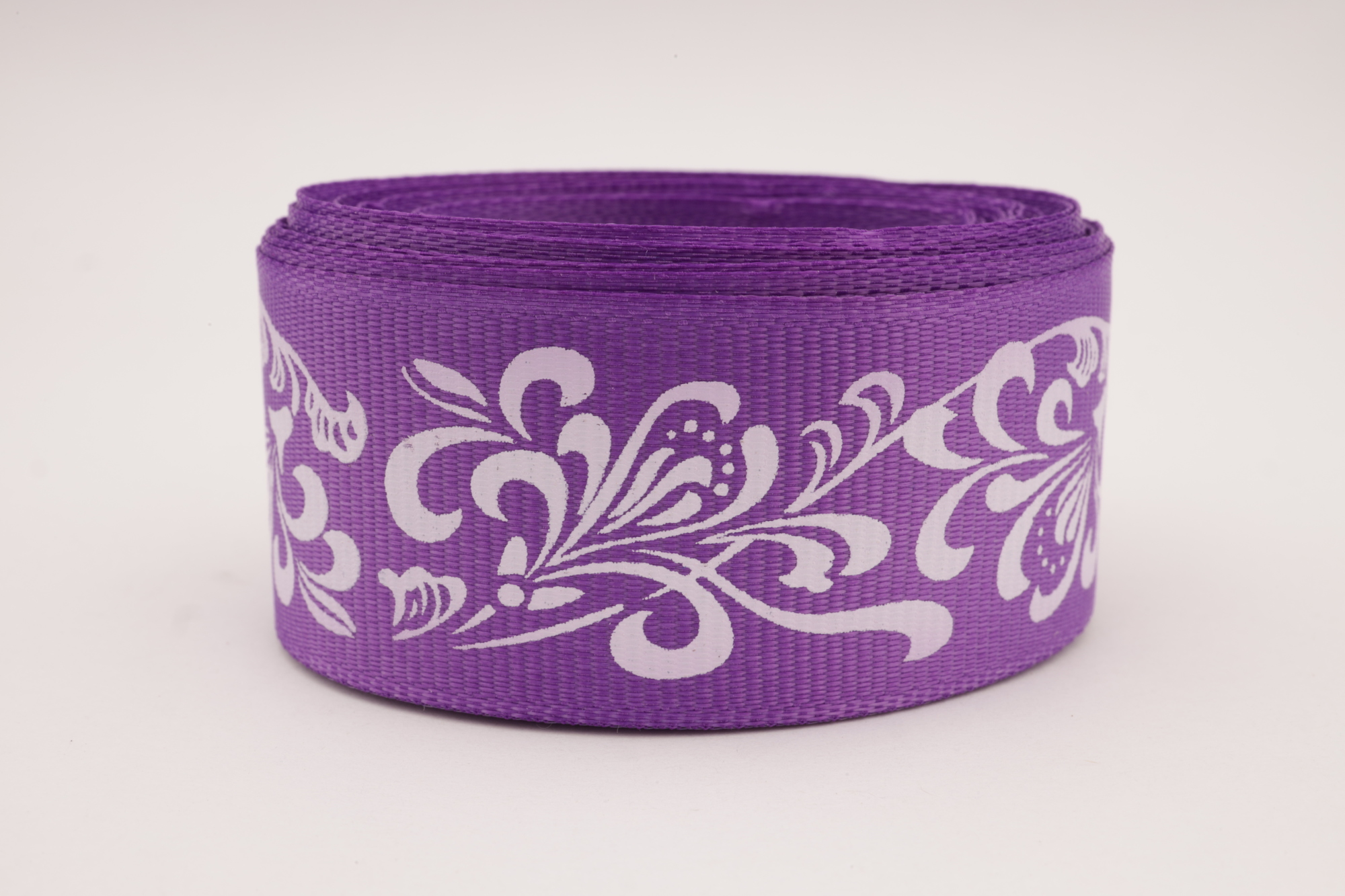Репсовая лента 25мм * 6 ярдов  фиолетового цвета с рисунком "Узор" обладает плотной тканной текстурой и имеет  мелкий поперечный рубчик. Одной из особенностей репсовой ленты является то, что она великолепно держит форму и не деформируется при многократном использовании. Использование репсовой ленты многогранно: как при пошиве детской и взрослой одежды, так и в качестве отделочного материала при работе с плотной тканью или кожей.