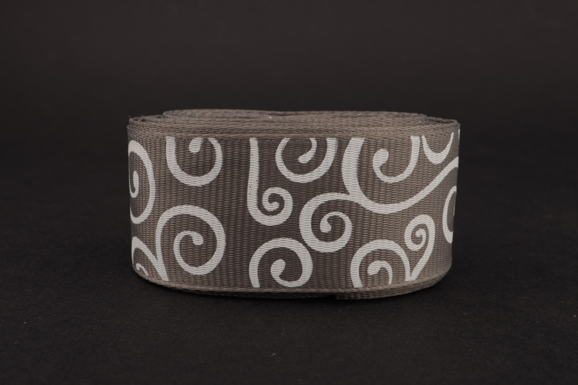 Купить репсовую ленту темно-серого цвета с рисунком "Вензеля (белый)" 25мм * 6 ярдов оптом и в розницу по оптовым ценам с доставкой во все города России можно в нашем интернет-магазине.