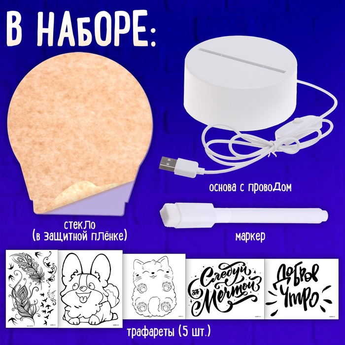 Набор для творчества «Чудесный ночник» — это уникальный набор для детей от 5 лет, который помогает развивать креативные навыки и фантазию. С помощью этого ночника ребёнок сможет создавать свои световые композиции, используя трафареты с милыми животными и разными надписями.