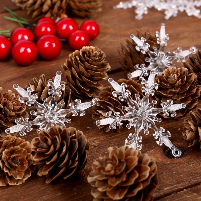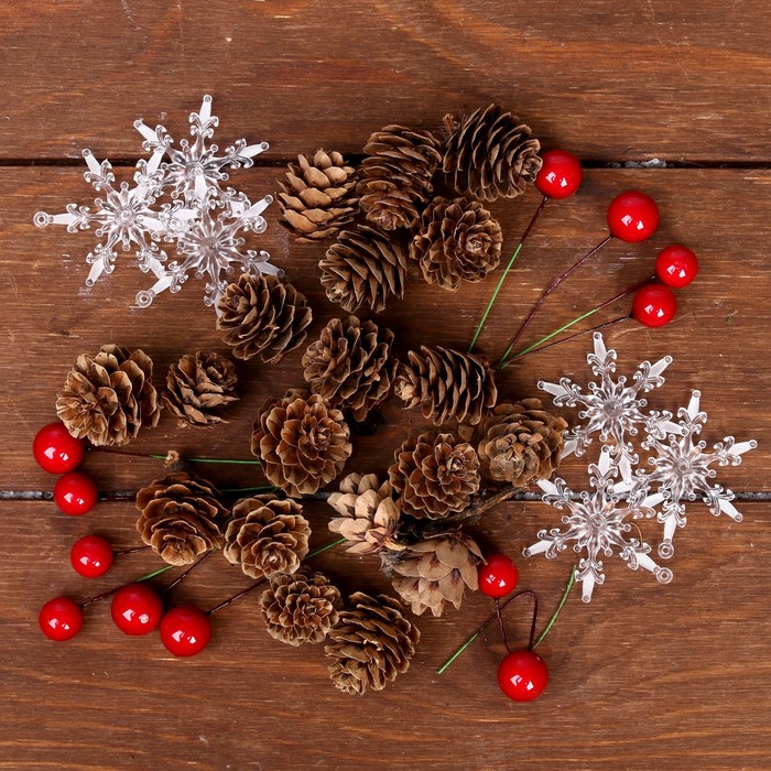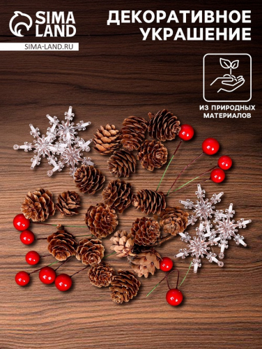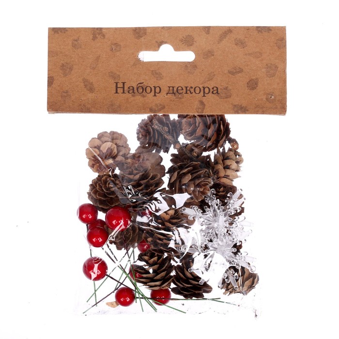 Набор декора «Ледяная сказка» — это стильное решение для создания праздничной атмосферы в интерьере. Комплект включает элементы из пластика и природные материалы, такие как шишки, что придаёт украшению естественный и зимний вид. Идеально подходит для новогоднего декора в скандинавском стиле.