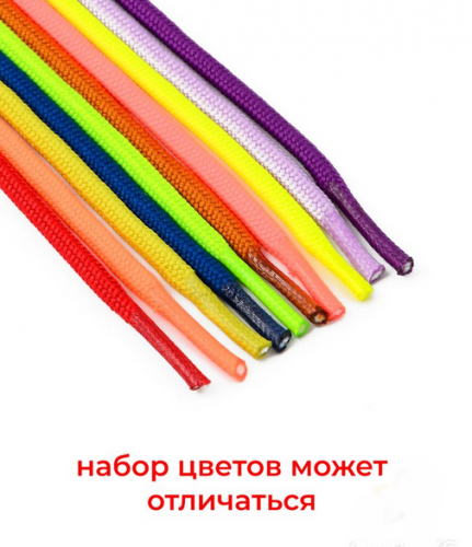 Круглые шнурки, имеют наконечники из полиуретана. В упаковке 10 разноцветных пар.