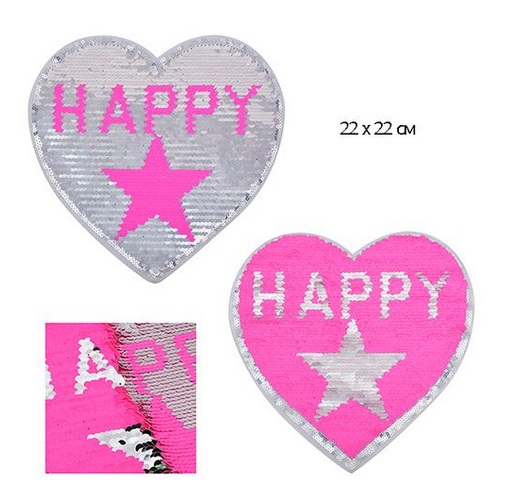 Аппликации пришивные СЕРДЦЕ HAPPY с двусторонними пайетками 22х22см цв.роз/серебро уп.2 шт
