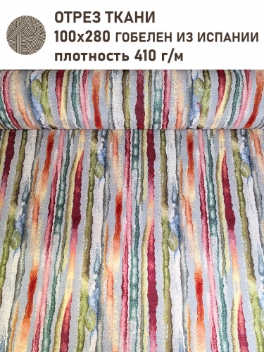 Рисунок создается переплетением нитей различных цветов и фактуры. Состав ткани: хлопок ( дающий фактуру и приятную тактильность ) и синтетические нити ( придающие износостойкость ). Плотность гобелена 410 г на кв.метр.