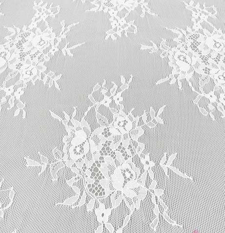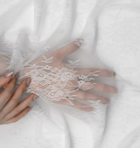 Прозрачный ажурный материал с растительным орнаментом, отделанным рельефной нитью. Поверхность представляет собой тонкие кружевные элементы, соединенные сетчатыми "связками". Материал очень нежный и приятный, слегка эластичных за счет плетения. Вечерний наряд может полностью состоять из кружева, а может дополнен отдельными кружевными элементами рукавов или спинки.