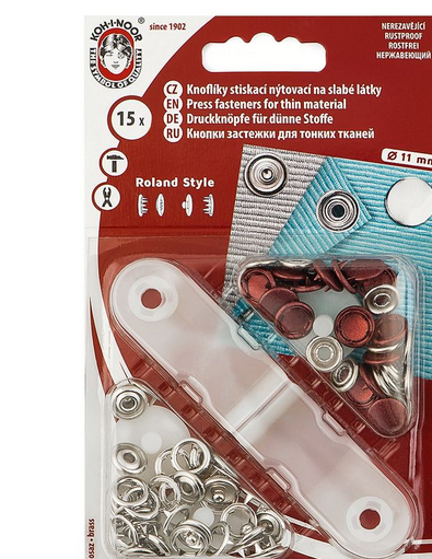 Металлические нержавеющие установочные закрытые кнопки из 4-х частей для тонких тканей. В комплект входит устройство для установки.
