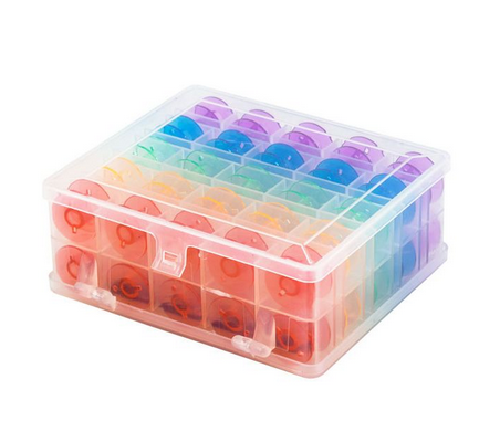 Удобный пластиковый органайзер для машинных шпулек. Наполнен 50 шпулями разных цветов. Шпули подходят большинству швейных машин (как для швейных машин марки Janome/New Home). Органайзер открывается с двух сторон для лучшего доступа к шпулям. Плотное закрытие и надежные замки.