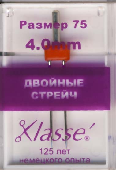 Двойные - идеально подходят для шитья фамильных вещей и декоративной отстрочки. Размер 2 мм, 2.5 мм, 3 мм, 4 мм и 6 мм указывают расстояние между иглами. В наличие есть иглы двойные для трикотажа, двойные для стрейча и двойные для джинсы и металлизированной нити. Двойные иглы закрепленны в полиамидном блоке, и поэтому их необходимо использовать при низкой скорости и не долго.