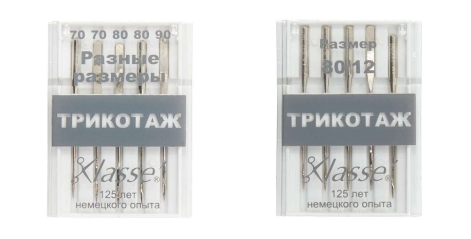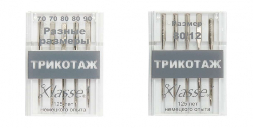 Трикотаж (K1) - идеально подходят для интерлочного трикотажного полотна, для ластичного полотна, для полотна с густым ворсом, для двухфонтурного кругловязаного полотна и для большинства трикотажных тканей. Закругленный кончик иглы защищает ткань от прокалывания и повреждения волокон. Доступные размеры: 70/10, 80/12, 90/14, 100/16 и наборы различных размеров.