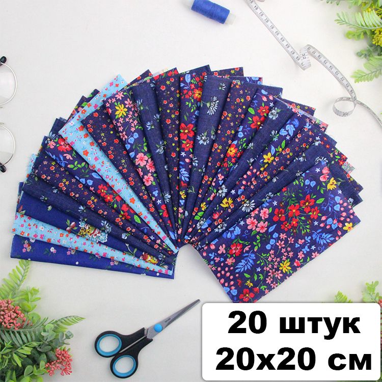Набор ткани для пэчворка и шитья Цветы темно-синие, ситец, 20х20 (20 шт)