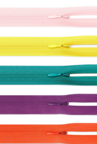 Молния потайная неразъемная ассорти. Звенья застежки расположены с изнаночной стороны молнии и закрыты тесьмой. В упаковке 5 цветов по 10 штук.