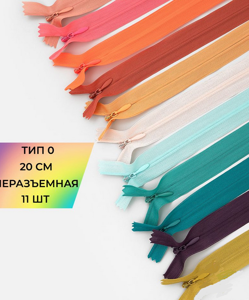 Молния потайная неразъемная ассорти. Звенья застежки расположены с изнаночной стороны молнии и закрыты тесьмой. В упаковке 11 цветов по 1 штуке каждый.