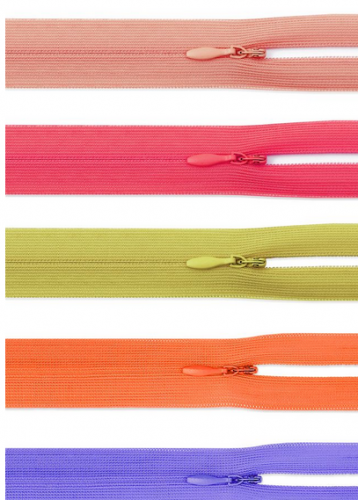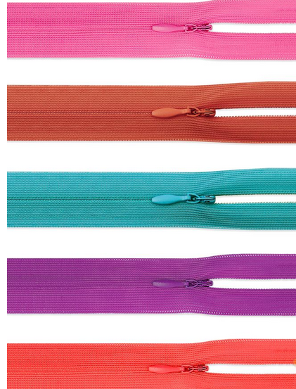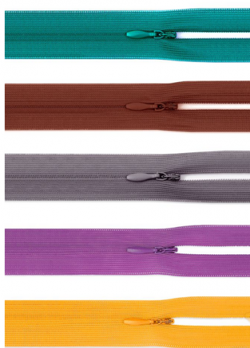 Молния потайная неразъемная ассорти. Звенья застежки расположены с изнаночной стороны молнии и закрыты тесьмой. В упаковке 5 цветов по 10 штук.