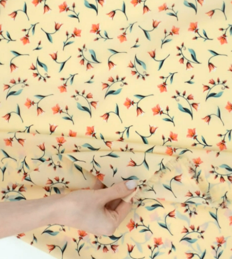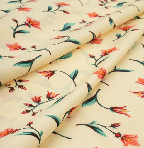 Тонкая легкая ткань с гладкой шелковистой поверхностью. На лицевой стороне полотна расположен принт. Материал мягкий, хорошо драпируется.