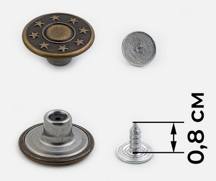Пуговица джинсовая круглая с рельефной поверхностью, крепится на ткань через прокол маленьким саморезом.