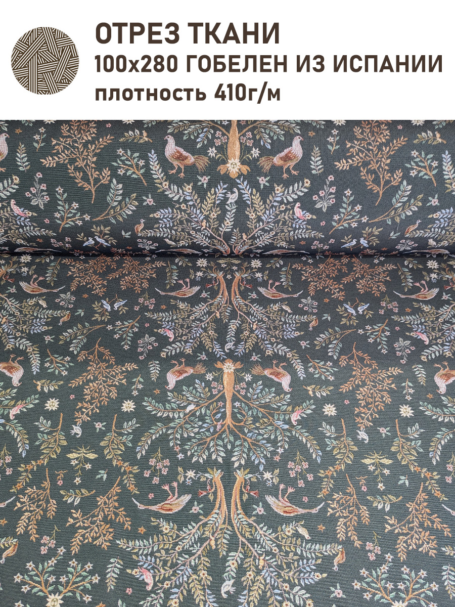 Рисунок создается переплетением нитей различных цветов и фактуры. Состав ткани: хлопок ( дающий фактуру и приятную тактильность ) и синтетические нити ( придающие износостойкость ). Плотность гобелена 410 г на кв.метр.