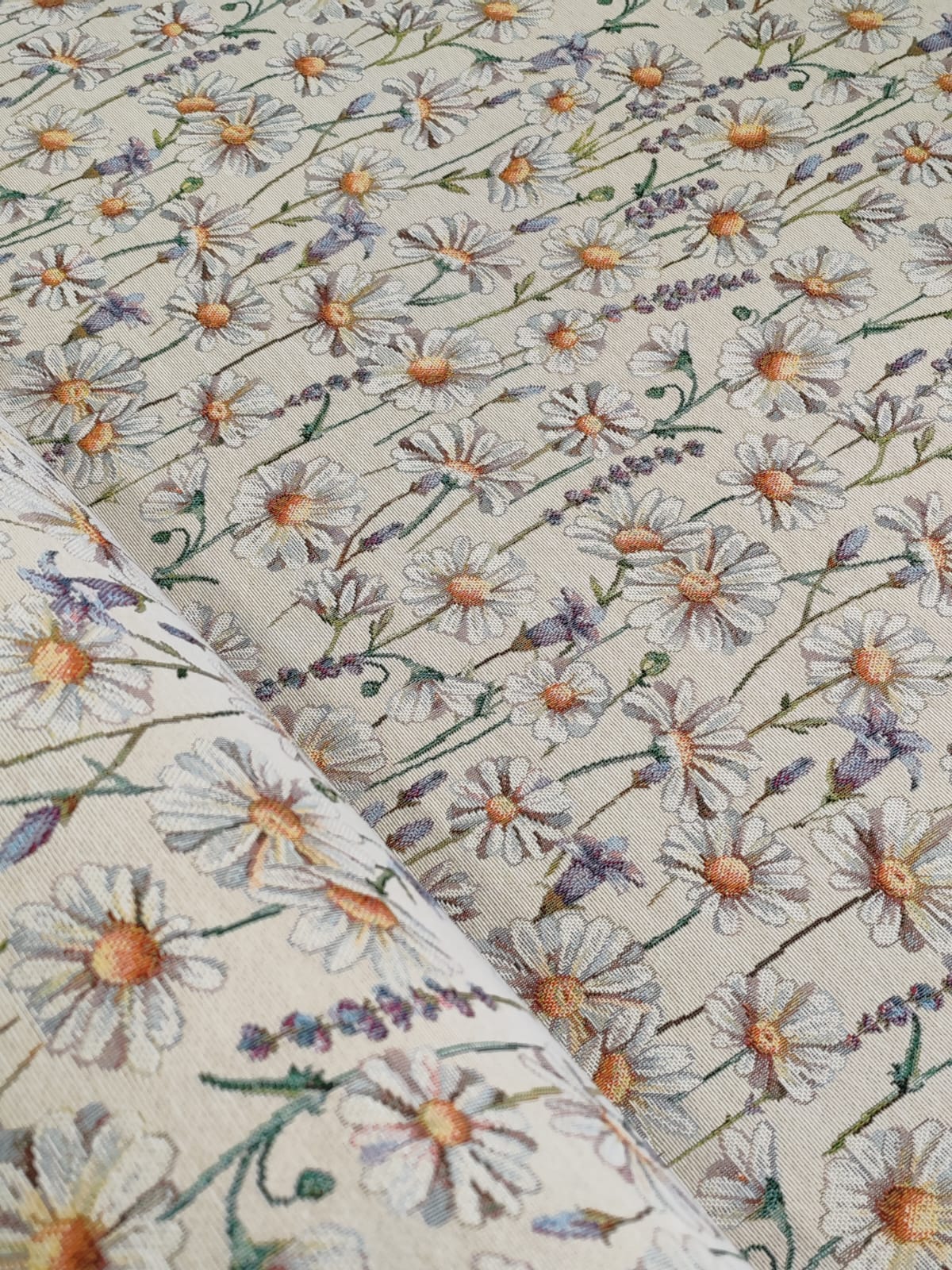 Рисунок создается переплетением нитей различных цветов и фактуры. Состав ткани: хлопок ( дающий фактуру и приятную тактильность ) и синтетические нити ( придающие износостойкость ). Плотность гобелена 410 г на кв.метр.