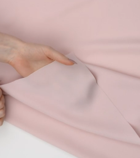 Легкая, но вместе с тем прочная гладкокрашеная ткань с рельефной поверхностью в диагональный рубчик. Приятная и мягкая на ощупь, обладает легким матовым блеском и образует на изделиях красивые складки. Материал легкий с креповой фактурой, подходит для пошива одежды в классическом стиле и различных летних изделий.