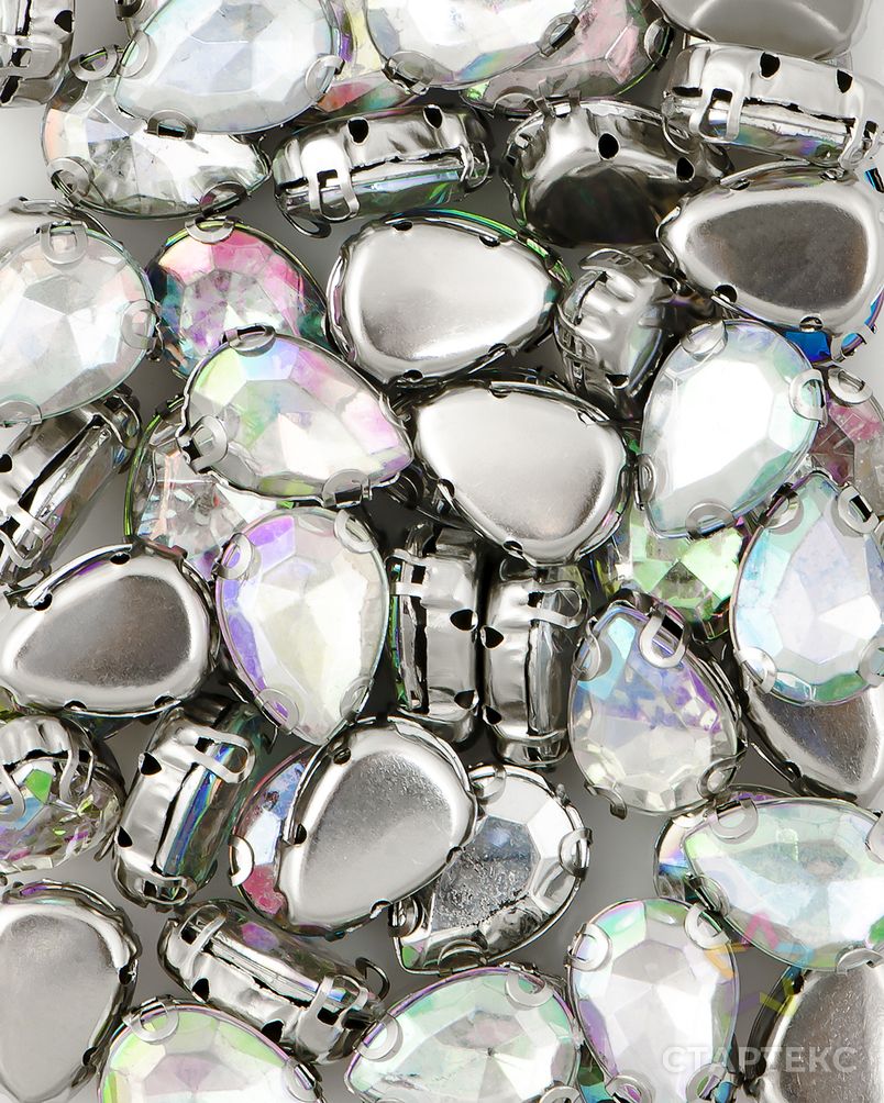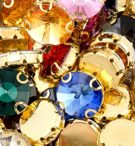 Пришивные акриловые стразы в оправе, с четырьмя отверстиями и плоским дном. Используются для декорирования одежды, головных уборов и предметов интерьера.