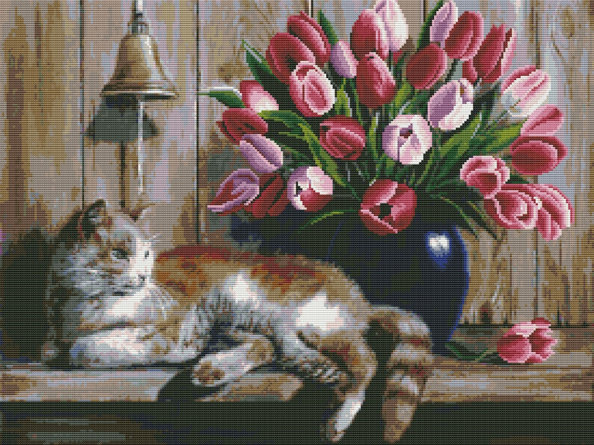Вышивка крестиком 40х50см, Кот и тюльпаны