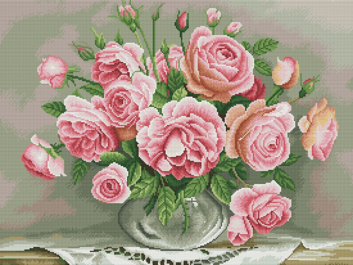 Вышивка крестиком 40х50см, Розы в стеклянной вазочке