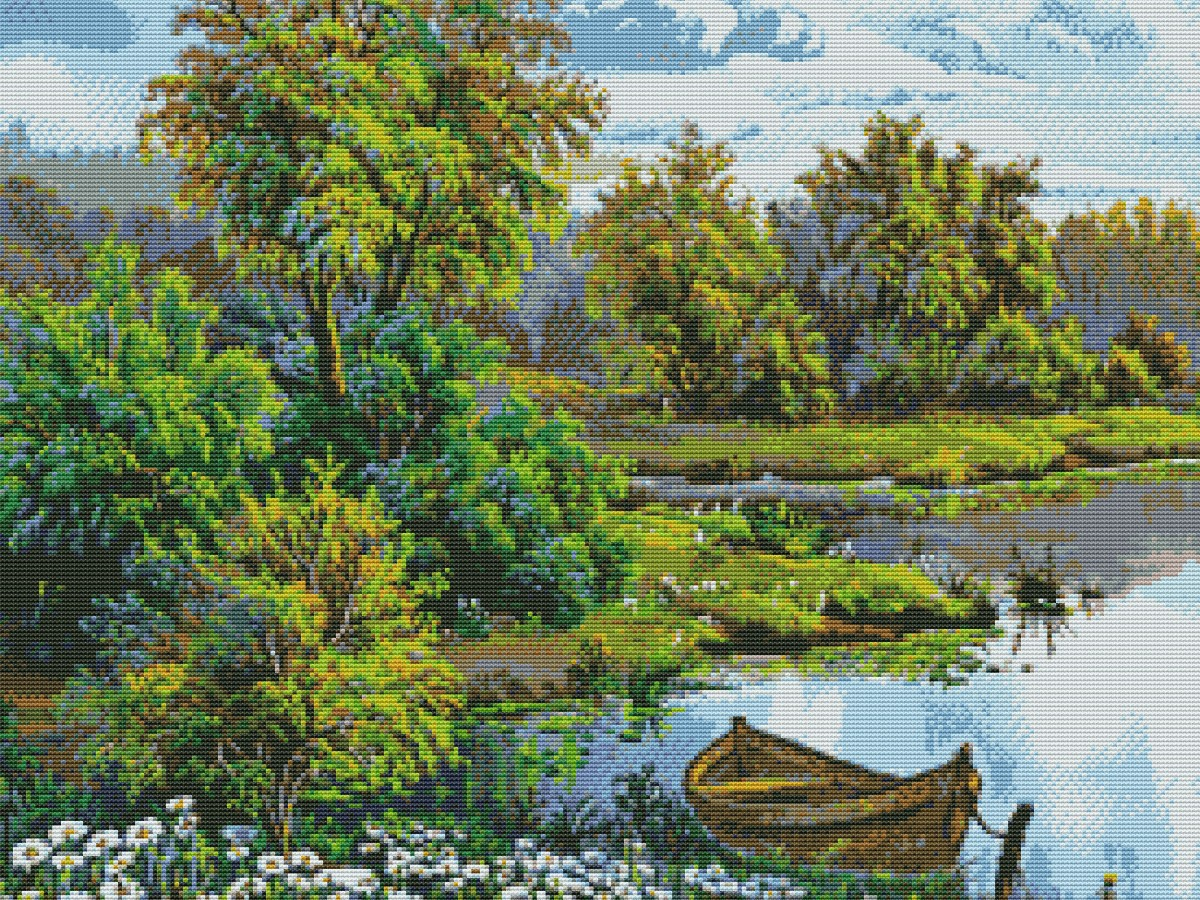 Вышивка крестиком 40х50см, Лодка у реки