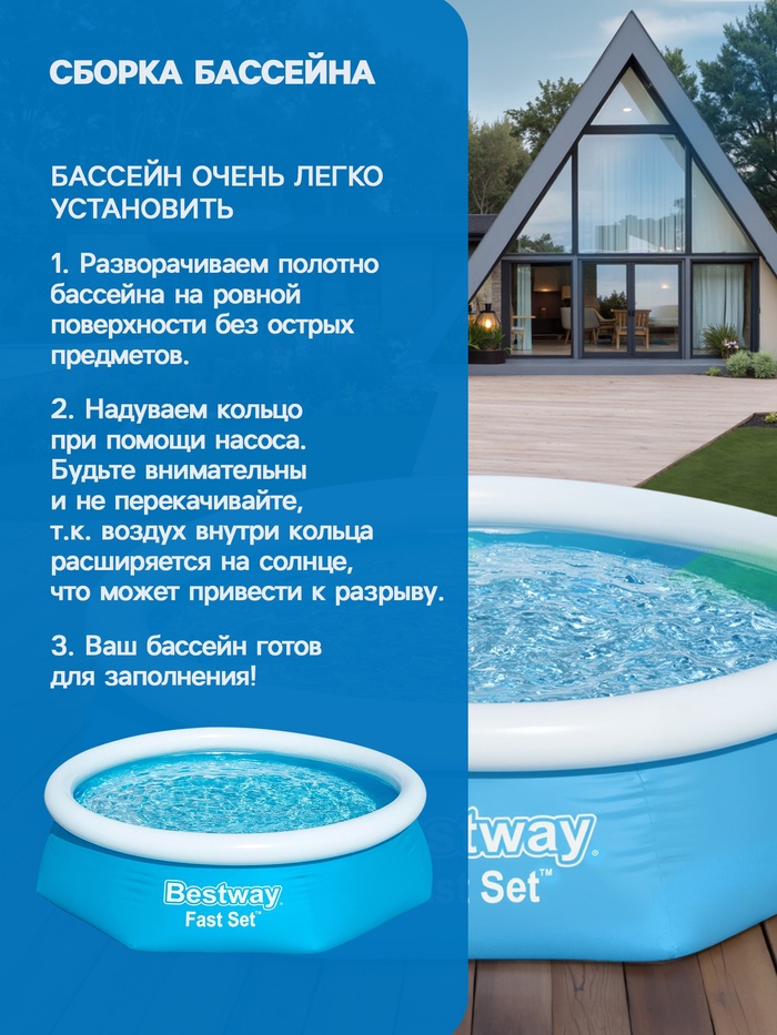 Бассейн подходит для размещения на придомовом участке. Для его установки нужна только ровная площадка, очищенная от острых предметов. Чтобы воспользоваться бассейном нужно просто развернуть его, надуть верхнее кольцо и налить воду.