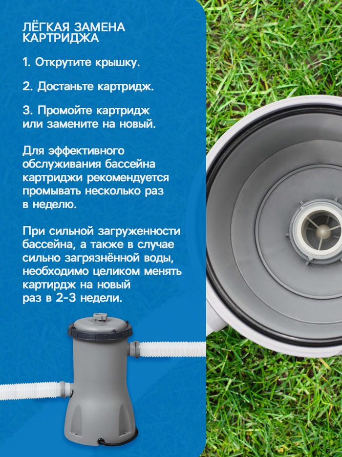Для эффективной работы фильтра-насоса рекомендуется менять или промывать картриджи раз в месяц, при непрерывной работе — 1 раз в 2 недели.