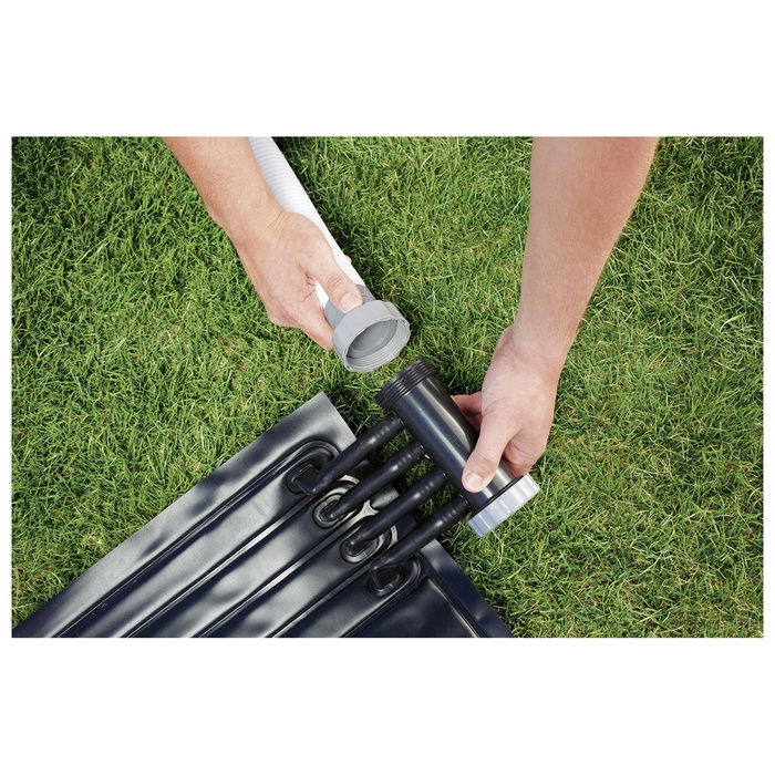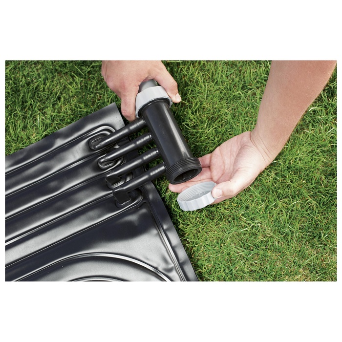 Коврик предназначен для нагрева воды в уличном бассейне. Коврик подключается к фильтр-насосу и пропускает воду через каналы, в бассейн поступает уже нагретая вода.