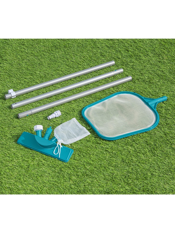 Набор для очистки бассейнов — это необходимый инвентарь, который должен быть у каждого обладателя каркасного или надувного бассейна. С ним вы затратите меньше сил и времени на очистку, а сам процесс пройдёт легко и приятно. Набор состоит из алюминиевой телескопической трубки, с помощью которой вы сможете достать даже до самого дальнего угла бассейна, вакуумной щётки с прозрачным сетчатым мешочком для сбора мусора под водой, а также сачка для улавливания крупного плавающего мусора, например листьев, травы и прочего.