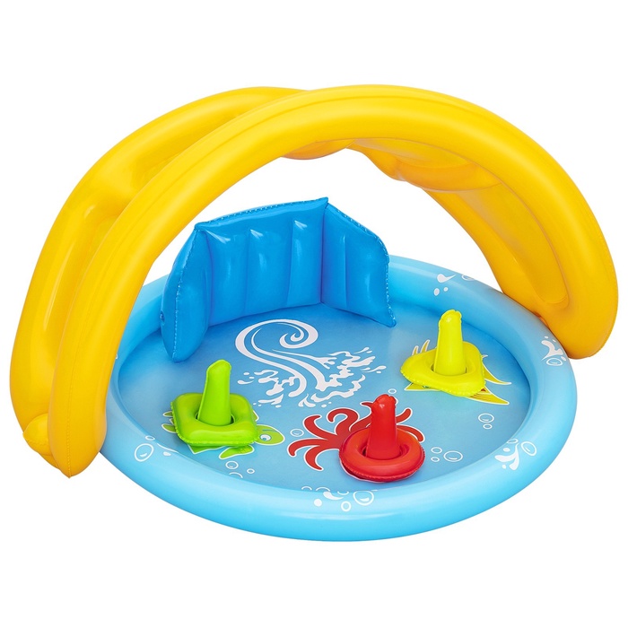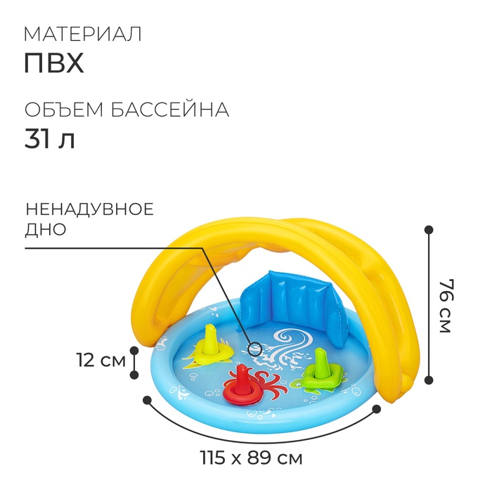 Детский бассейн можно разместить в доме и на улице. Модель оснащена поддерживающей спинкой и съёмным навесом от солнца. Цветные конусы и кольца служат для развития мелкой моторики рук ребёнка.