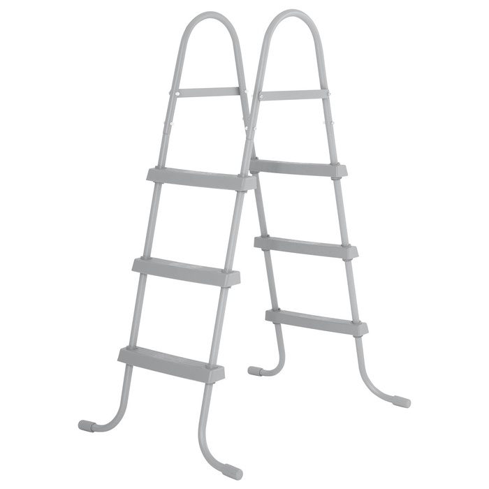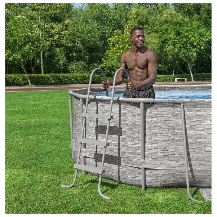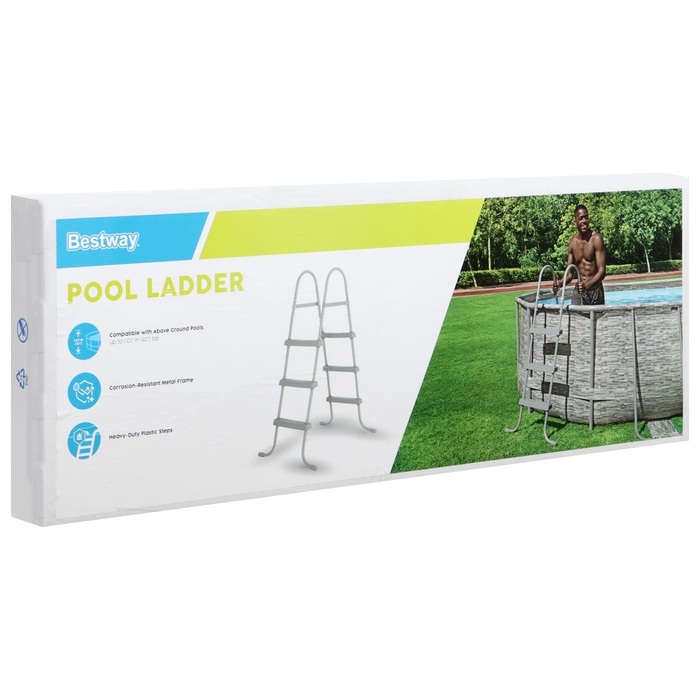 Лестница устанавливается по обе стороны бассейна. Каркас изготовлен из нержавеющего металлического сплава, ступени сделаны из прочного пластика. Выберите подходящее место для входа в бассейн и поставьте лестницу там, где вам удобно.