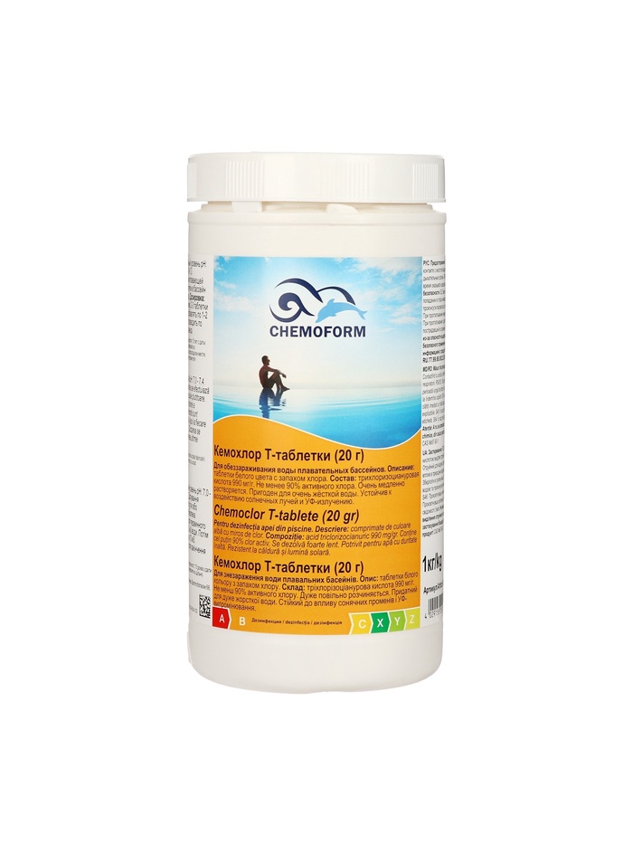 Кемохлор Т - 20-граммовые медленнорастворимые хлоросодержащие таблетки для длительной дезинфекции воды в бассейне.