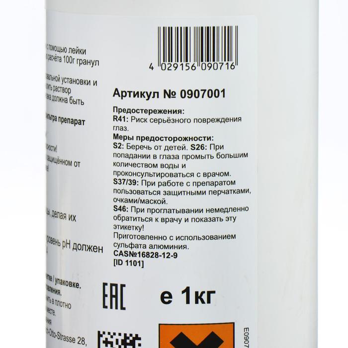 Применение: Предварительно растворить гранулы в тёплой воде. Расчётное количество равномерно распределить по глади воды. Для продолжительной флокуляции установить нужное впрыскиваемое количество насоса-дозатора. Разбавленный препарат использовать в течение недели.