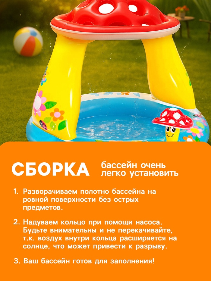 Детский игровой комплекс «Гриб» с надувным дном — это уникальное развлечение, которое точно не даст ребёнку заскучать. Яркая конструкция в виде гриба включает в себя две основные функции: купание и защиту от вредных излучений благодаря шляпке грибочка, которая служит тентом. В таком бассейне ребёнок сможет не только освежиться в летний зной и разнообразить досуг, но и перестать бояться воды. Безопасность крохи обеспечат надувные бортики. В комплекте есть малыш-мухомор, который вставляется в специальное отверстие. Яркие сочные цвета и уникальный дизайн обязательно понравятся как малышу, так и взрослым.