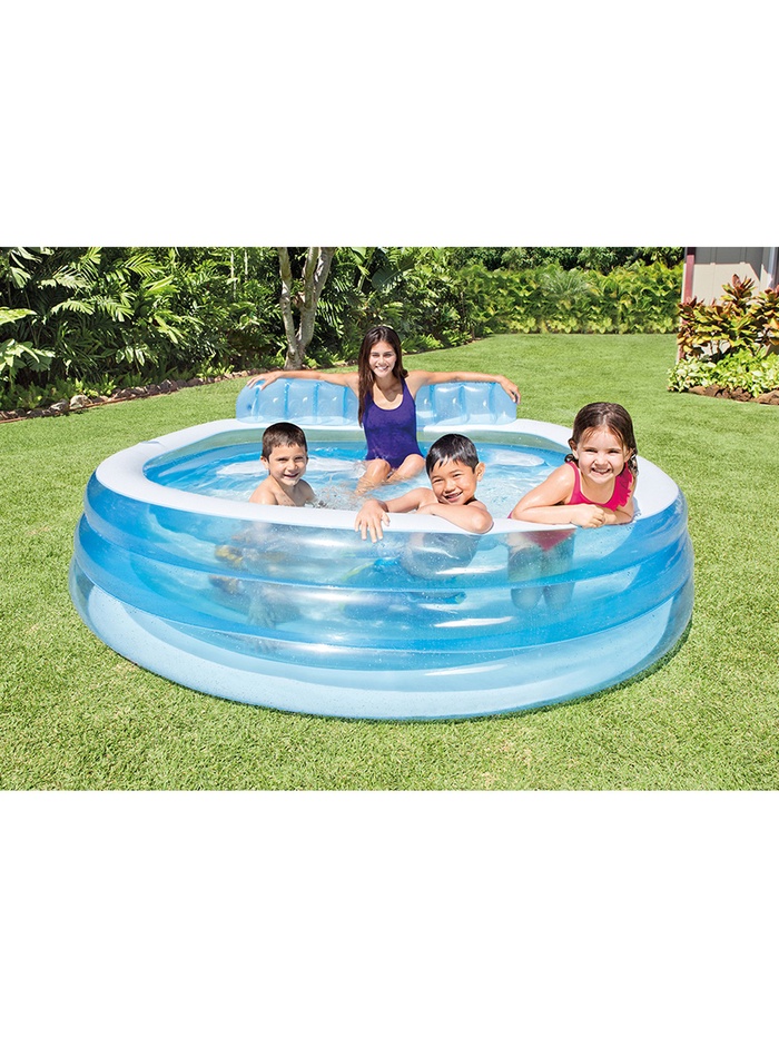 Надувной бассейн отлично подойдет и для взрослых, и для детей, имеет встроенную надувную скамейку, сидя на которой можно отдыхать и наблюдать за детьми. Встроенные подстаканники для прохладительных напитков также очень удобны и необходимы в жаркую погоду. Бассейн функциональный, он имеет две воздушные камеры, которые обеспечивают повышенную безопасность на воде. Сочетание нежных цветов, белого и голубого, придает бассейну определенный стиль. Кроме того, удобный сливной клапан позволит при необходимости спустить воду.